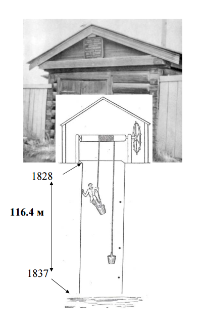 Шергин продолжил свою работу уже с научной целью, чтобы определить положение нижней границы мерзлого грунта. Работы проводились зимой, чтобы обеспечить хорошую вентиляцию в шахте за счет температурной инверсии. К 1837 году глубина шахты достигла 116 м. В 1844 г., во время экспедиции Миддендорфа в Шергинской скважине были установлены термометры в небольших (около 2 м) горизонтальных ответвлениях на различных глубинах, и организованы периодические измерения, технология которых показана на рисунке.